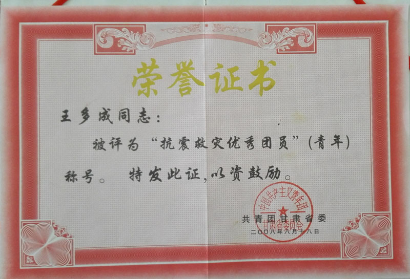 | 2008年榮獲抗震救災(zāi)優(yōu)秀青年稱號(hào)榮譽(yù)證書 | ||
