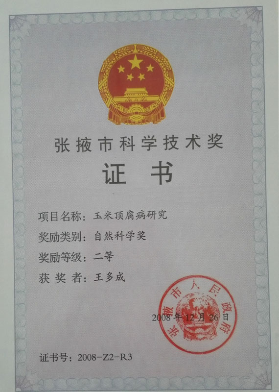 | 2008年榮獲張掖市科學(xué)技術(shù)二等獎(jiǎng)證書(shū) | ||