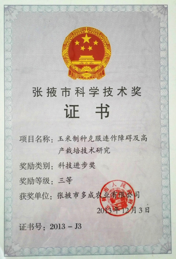 玉米制種克服連作障礙及高產栽培技術研究市科學技術獎三等獎
